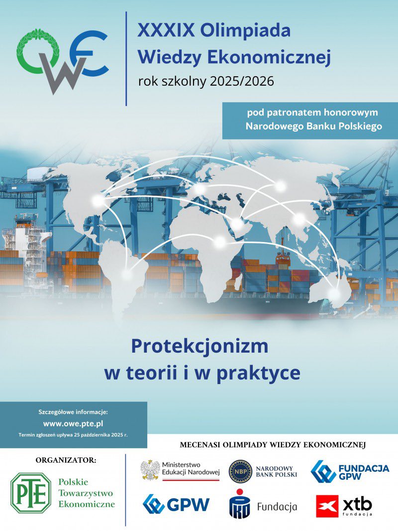 12 listopada 2025 r. odbył się etap szkolny XXXIX OWE, którego hasłem przewodnim było „Protekcjonizm w teorii i praktyce”. Olimpiada Wiedzy Ekonomicznej organizowana jest przez Polskie Towarzystwo Ekonomiczne pod patronatem honorowym Narodowego Banku Polskiego.